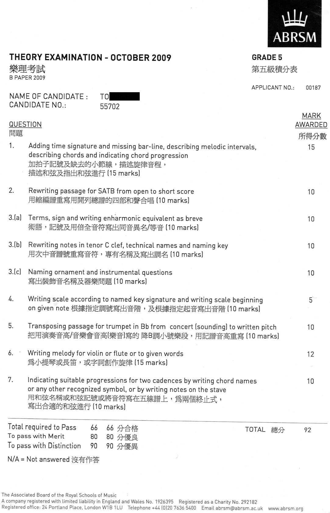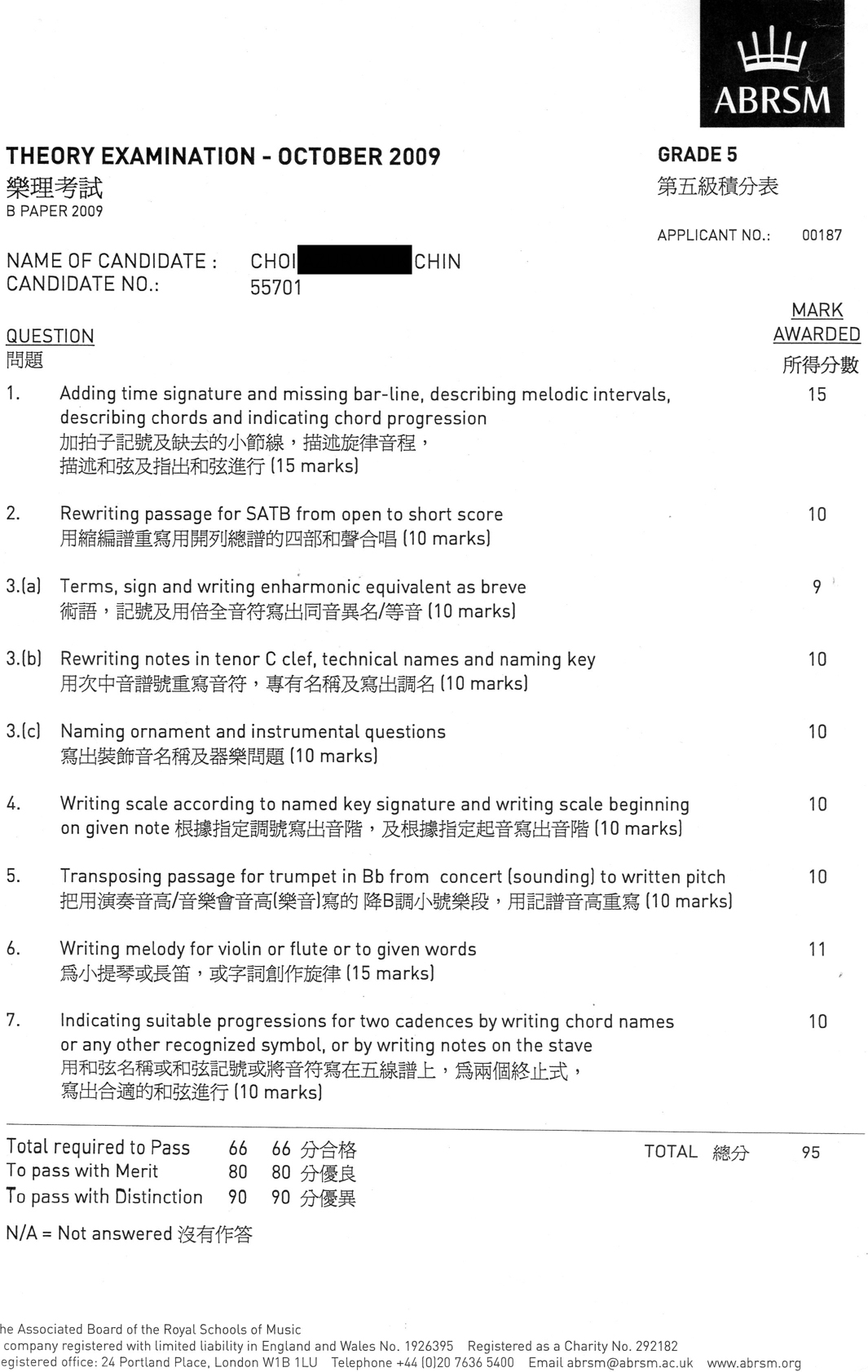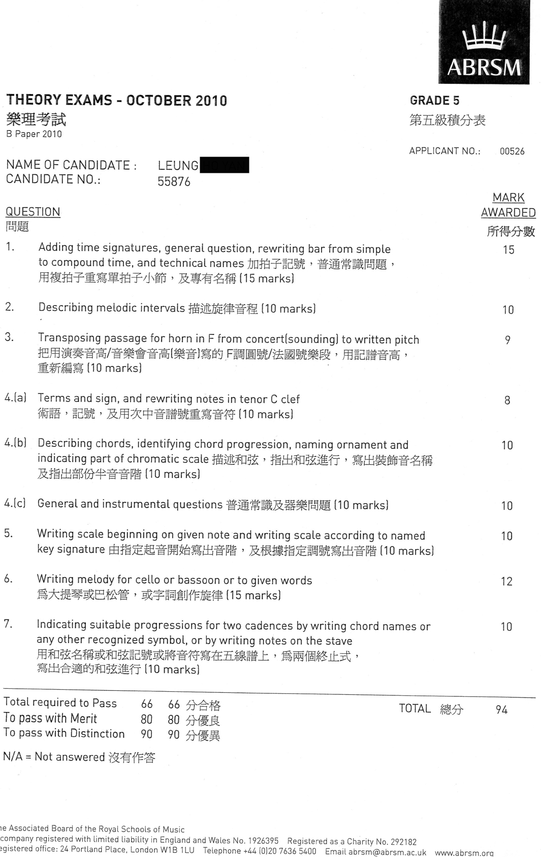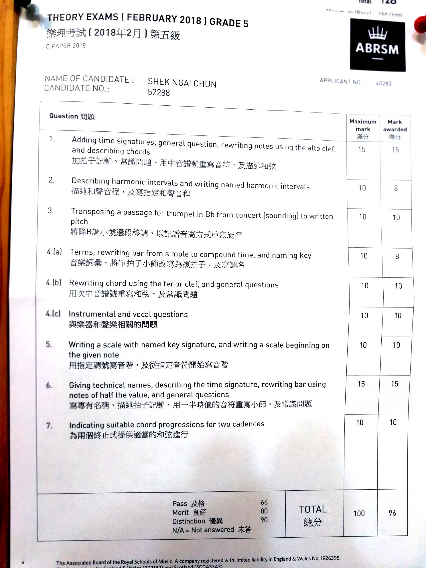 2018年2月樂理考試(第五級)成績: Distinction (96分)
