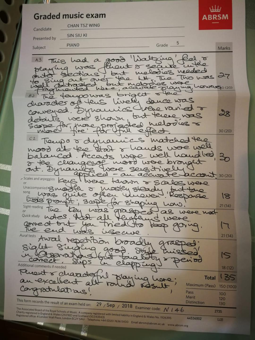 2018年2月樂理考試(第五級)成績: Distinction (100分)
